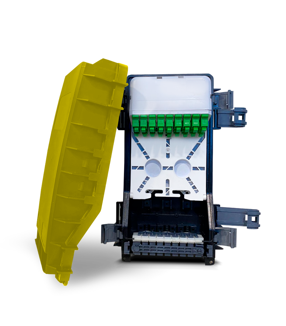 Fabricada em termoplásticos, com design arrojado e resistente a intempéries e impactos, além de proteção contra UV, possui duas bandejas de acomodação, permitindo a isolação da rede de infraestrutura à rede de atendimento, além do amplo espaço para acomodação de fibras e splitters para o atendimento de até 16 assinantes e ainda permite a utilização de 2 interfaces através de adaptadores do tipo SC para entrada conectorizada ou derivação da rede. A caixa ainda possui entrada, saída e derivação de cabos AS de até 13mm, permitindo a instalação e remoção de forma fácil, rápida e prática.